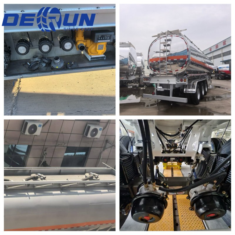Полу ремаркето с алуминиева сплав с алуминиева сплав DeRun разполага с резервоар, изработен от алуминиева сплав, предлагащ лека конструкция и устойчивост на корозия. Вътрешните анти-слой плочи и отделения ефективно потискат движението на течността, засилвайки стабилността по време на транспортирането. Горната част е оборудвана с капак на шахтата и интерфейс за възстановяване на парата, докато дъното разполага с пневматичен авариен спирачен клапан, всичко това е в съответствие с аржентинските правила за зареждане и разтоварване. Бялото отразяващо покритие намалява повишаването на температурата от слънчевата светлина, като свежда до минимум загубите на изпаряване на горивото. Опашката на резервоара включва запазен интерфейс за сензори за ниво на течност, улесняване на бъдещата инсталация на интелигентни системи за мониторинг от страна на клиентите.